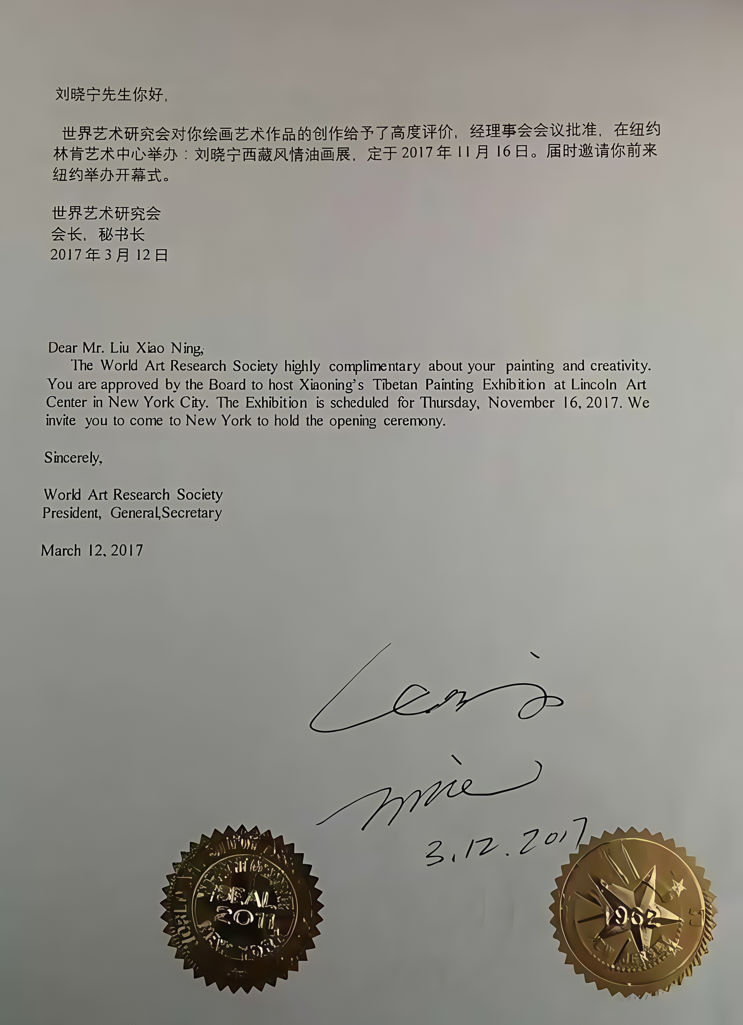 The World Art Research Society highly praised Liu Xiaoning’s artistic creativity and officially invited him to hold the “Tibetan Painting Exhibition” at Lincoln Art Center, New York, in 2017.