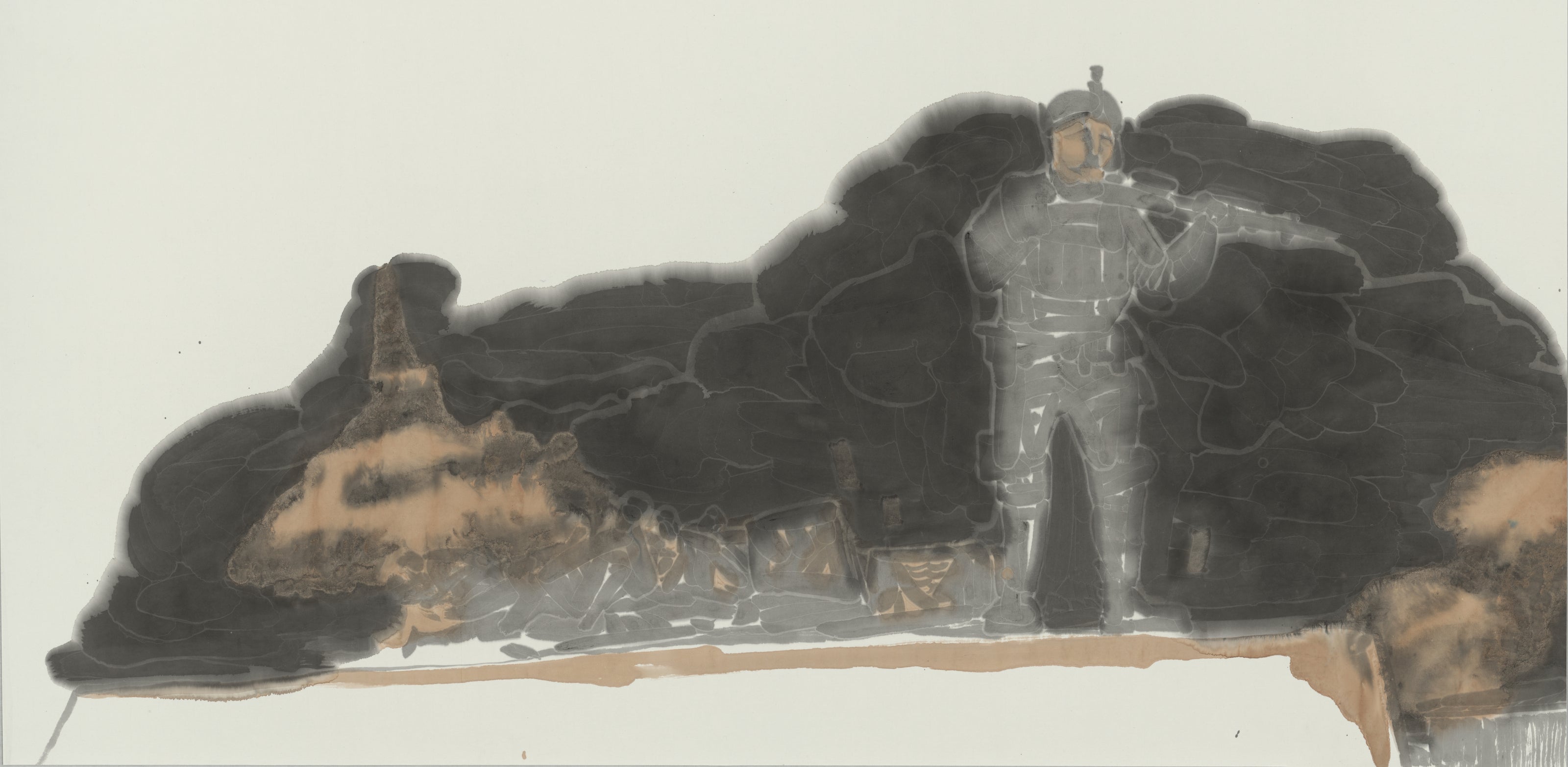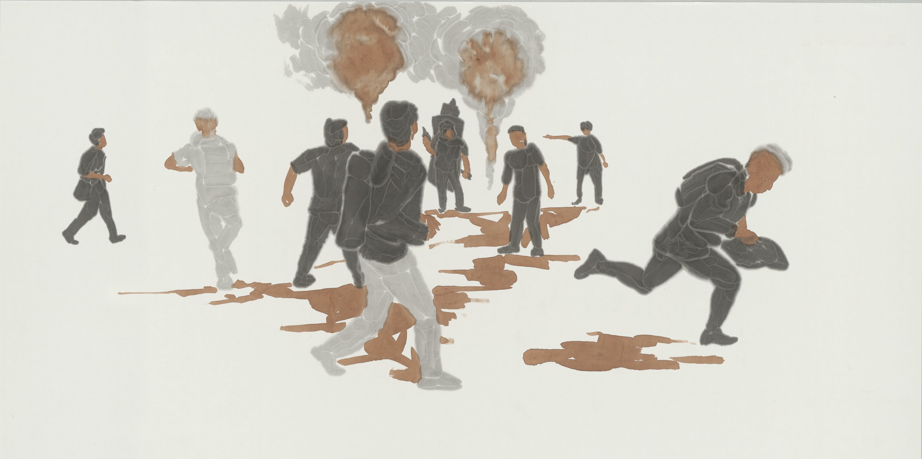 By mixing tea into the ink, he creates tones with greater transparency and warmth—somewhere between watercolor and traditional ink. As the mixture settles onto the paper, tea and ink merge naturally, forming gentle transitions and unique brownish hues that make figures seem to slowly surface from the composition.