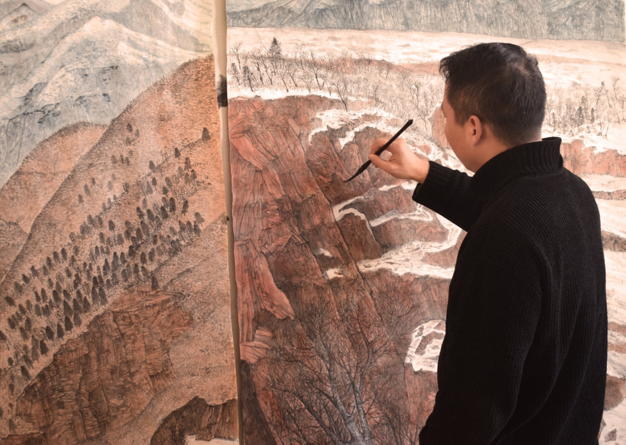 Born in 1989, Liu Yipeng currently lives and works in Shaanxi, China. His ink-based practice constructs a landscape that exists between physical scenery and inner imagination, shaped by a strong sense of spatial rhythm and restrained color relationships. In his work, mountains are reduced to dense, silent silhouettes, while expanses of water unfold as near-monochrome fields, allowing the composition to achieve a quiet yet powerful unity through simplification. The recurring animal figures and symbolic elements do not function as narrative subjects, but rather as points of scale and emotional reference, guiding the viewer into a slow, contemplative experience between vastness and solitude. Through a controlled use of blank space, color planes, and measured brushwork, Liu transforms traditional ink language into a contemporary visual sensibility, where landscape becomes not merely something to be seen, but a space to inhabit and reflect within.