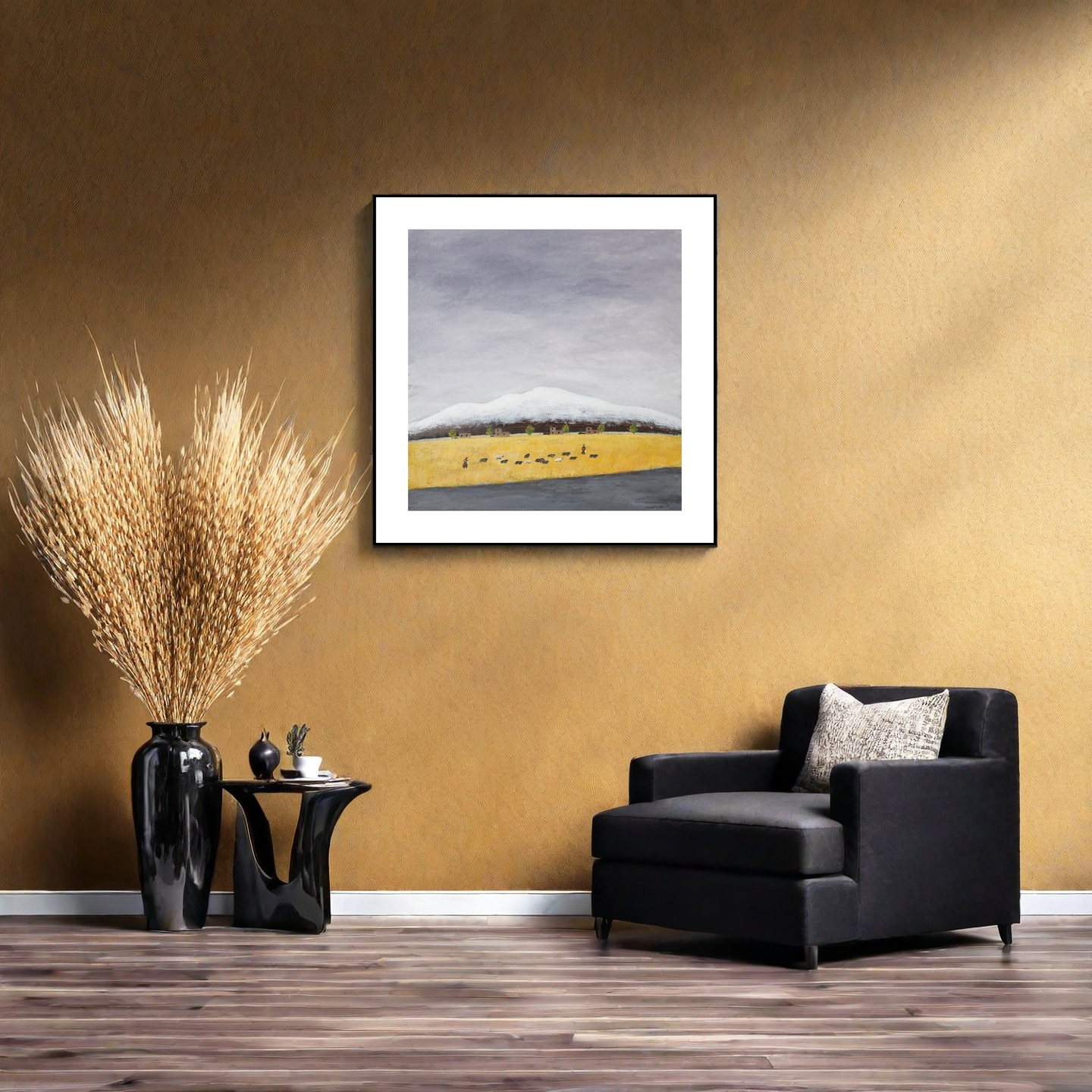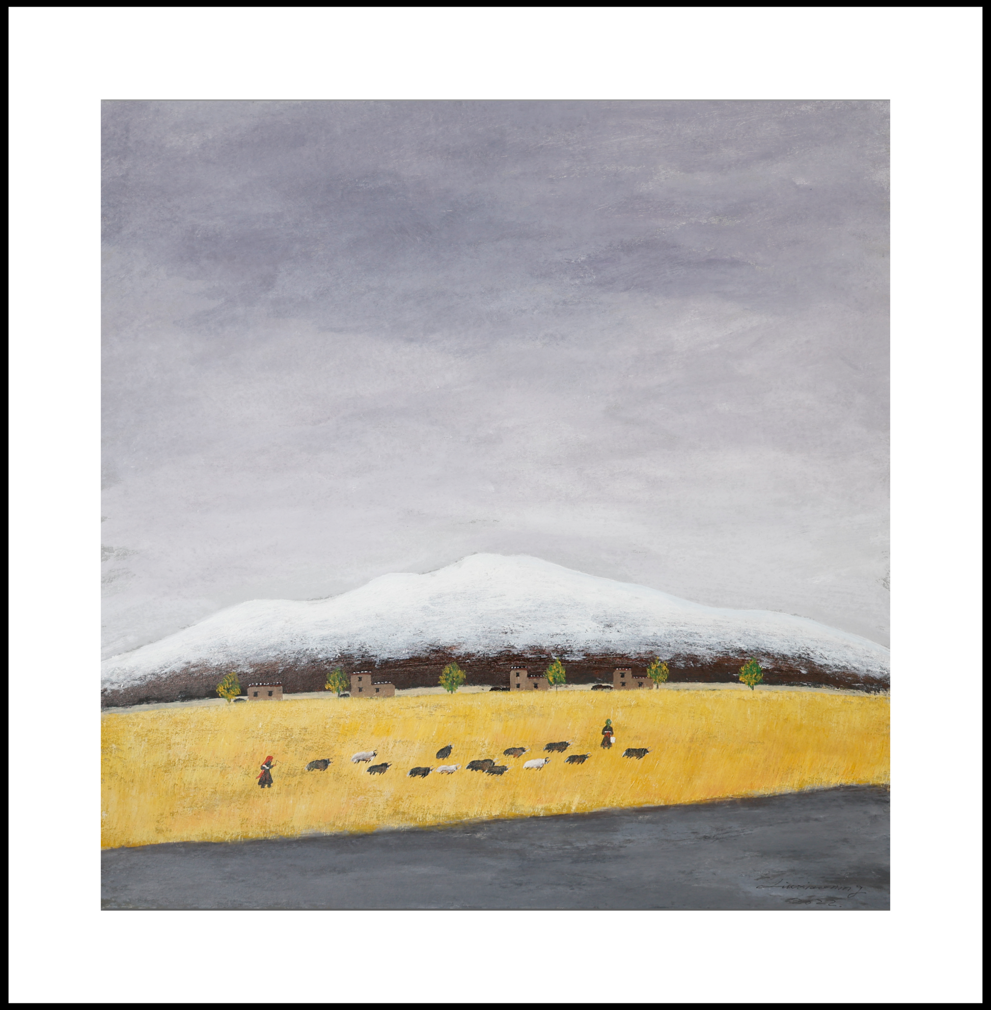 The composition portrays a serene plateau in late autumn: distant snow-capped peaks contrast with golden fields, where two herders and their flock move quietly across the land. The scene embodies both the stillness of nature and the resilience of human life on the highland.