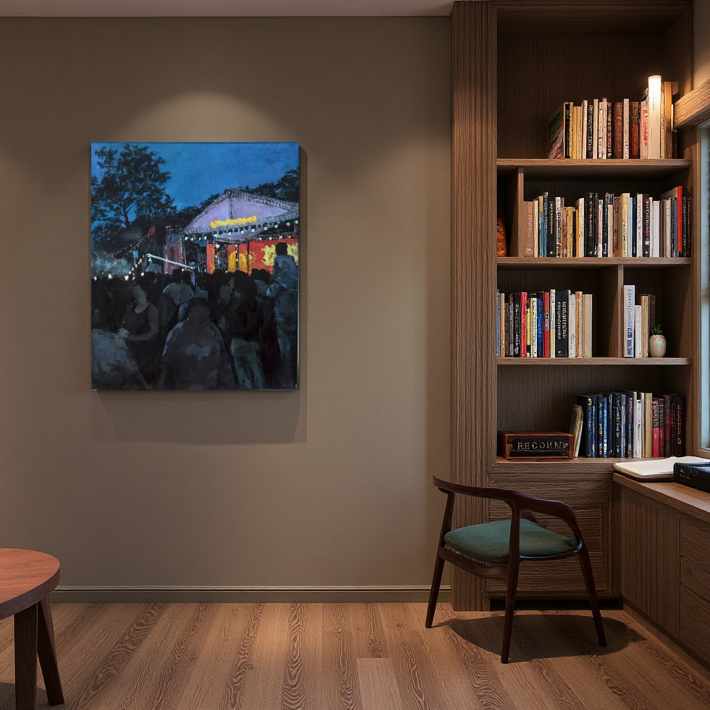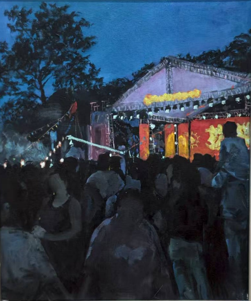 This painting reflects life in a small Chinese county town during the late 20th and early 21st century. On summer nights, makeshift outdoor stages lit up with colorful lights brought the community together. Amidst the crowd, a child sits on his father’s shoulders, watching the performance from above—a tender memory of love and protection.