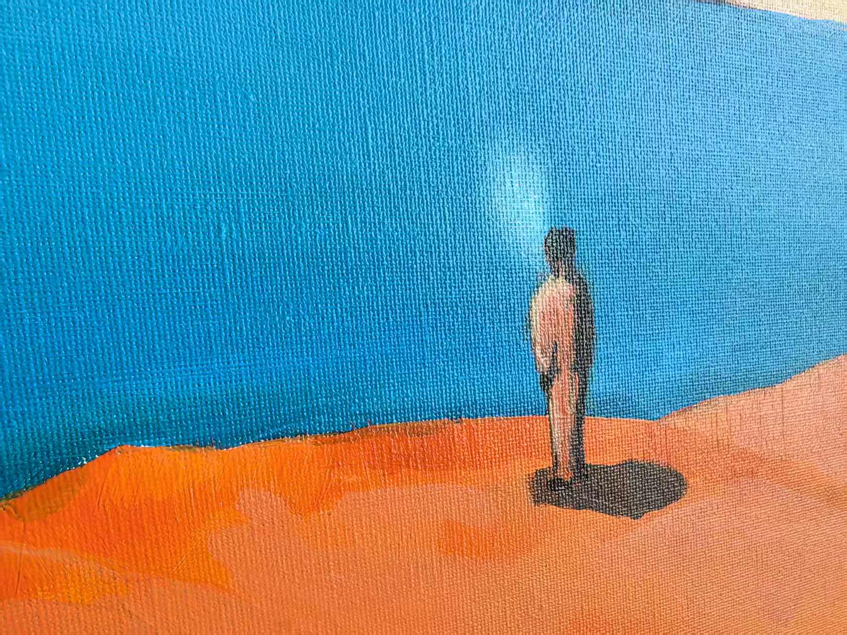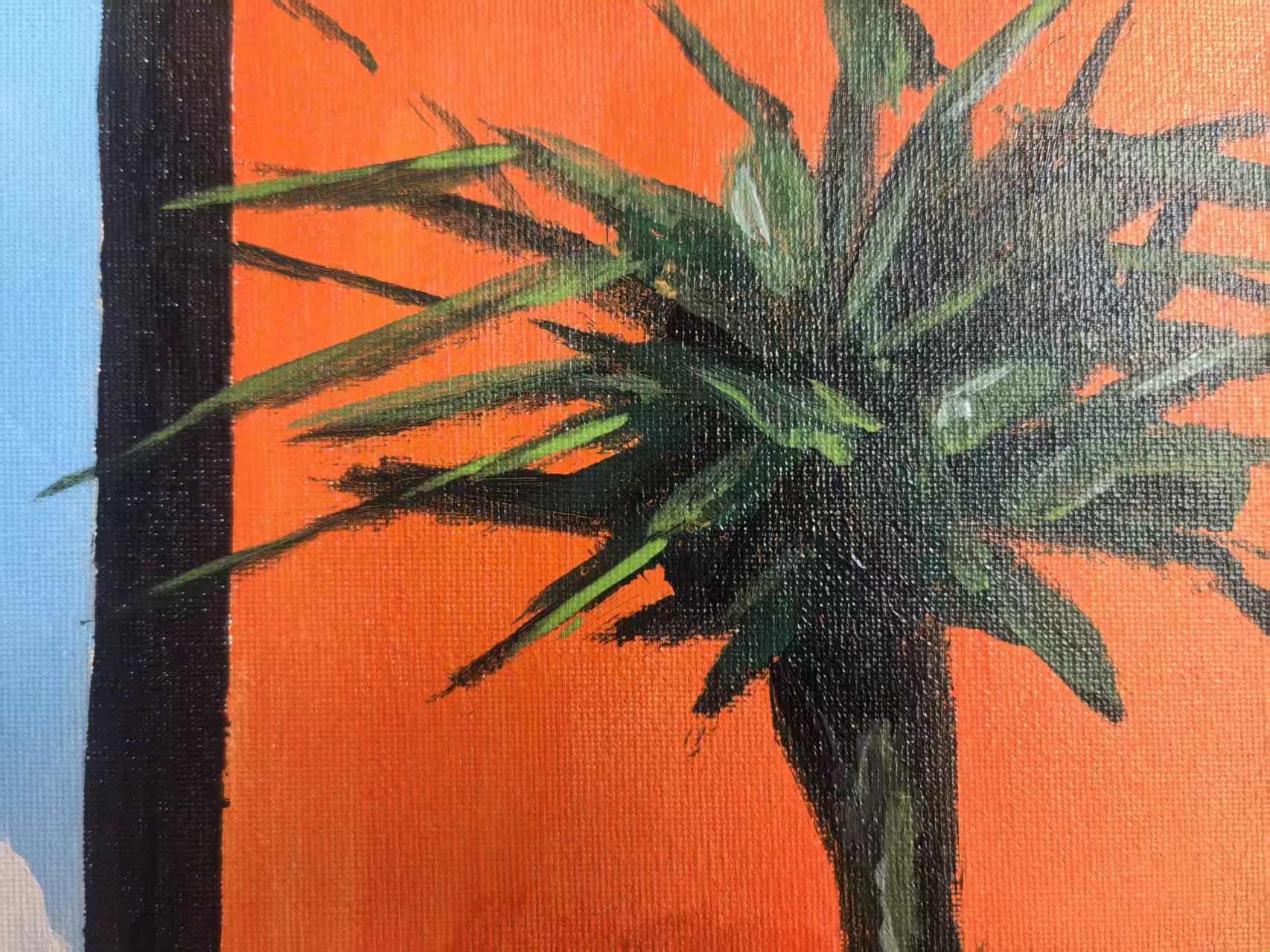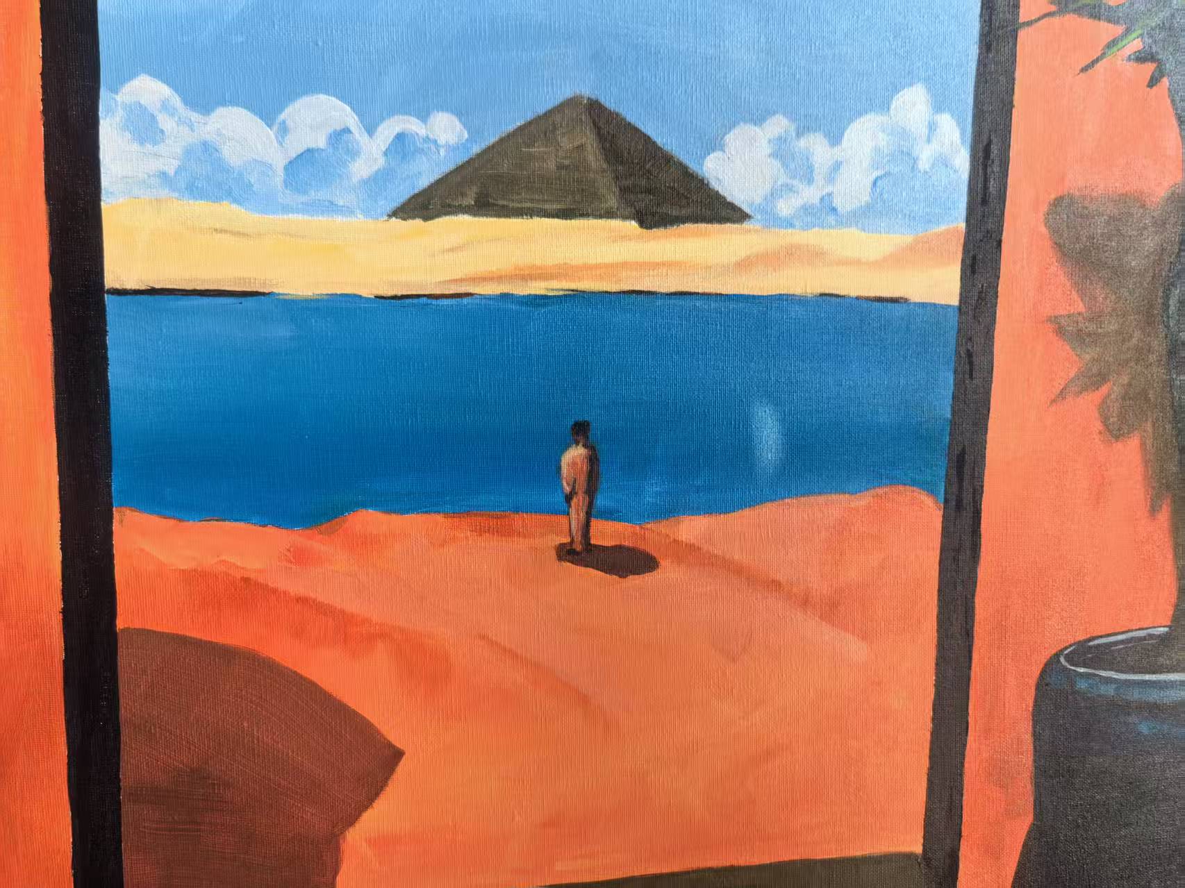 Gate of Eden is an original oil painting created by a MAGICBEAR-ART contracted artist. A grand archway frames a dreamlike vista—blue sky, drifting clouds, golden desert, tranquil sea, and a distant pyramid—suggesting a symbolic passage from reality to an ideal realm. Bold color blocks and striking contrasts blend modern decorative appeal with poetic symbolism, evoking hope, freedom, and exploration.