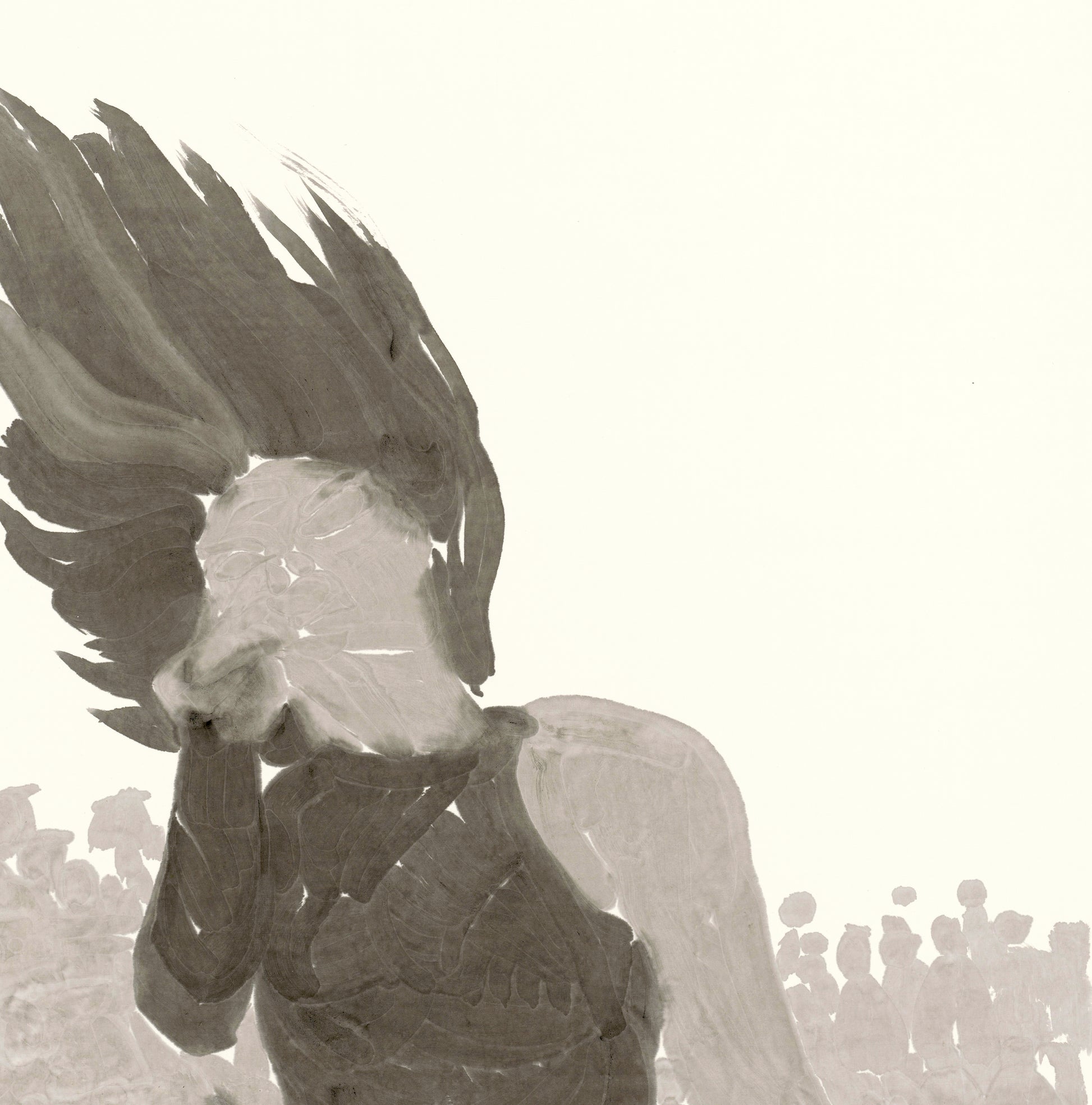 The figure, rendered in diffused monochrome tones, appears caught in a moment between silence and eruption.