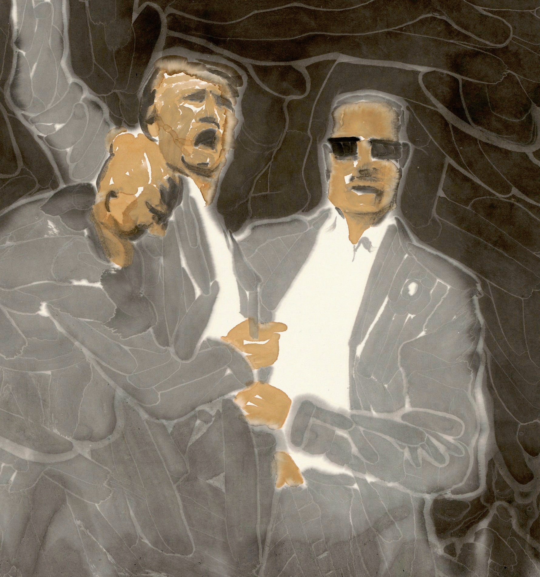 Rather than depicting a literal event, He Jun employs symbolic composition, bold ink tones,