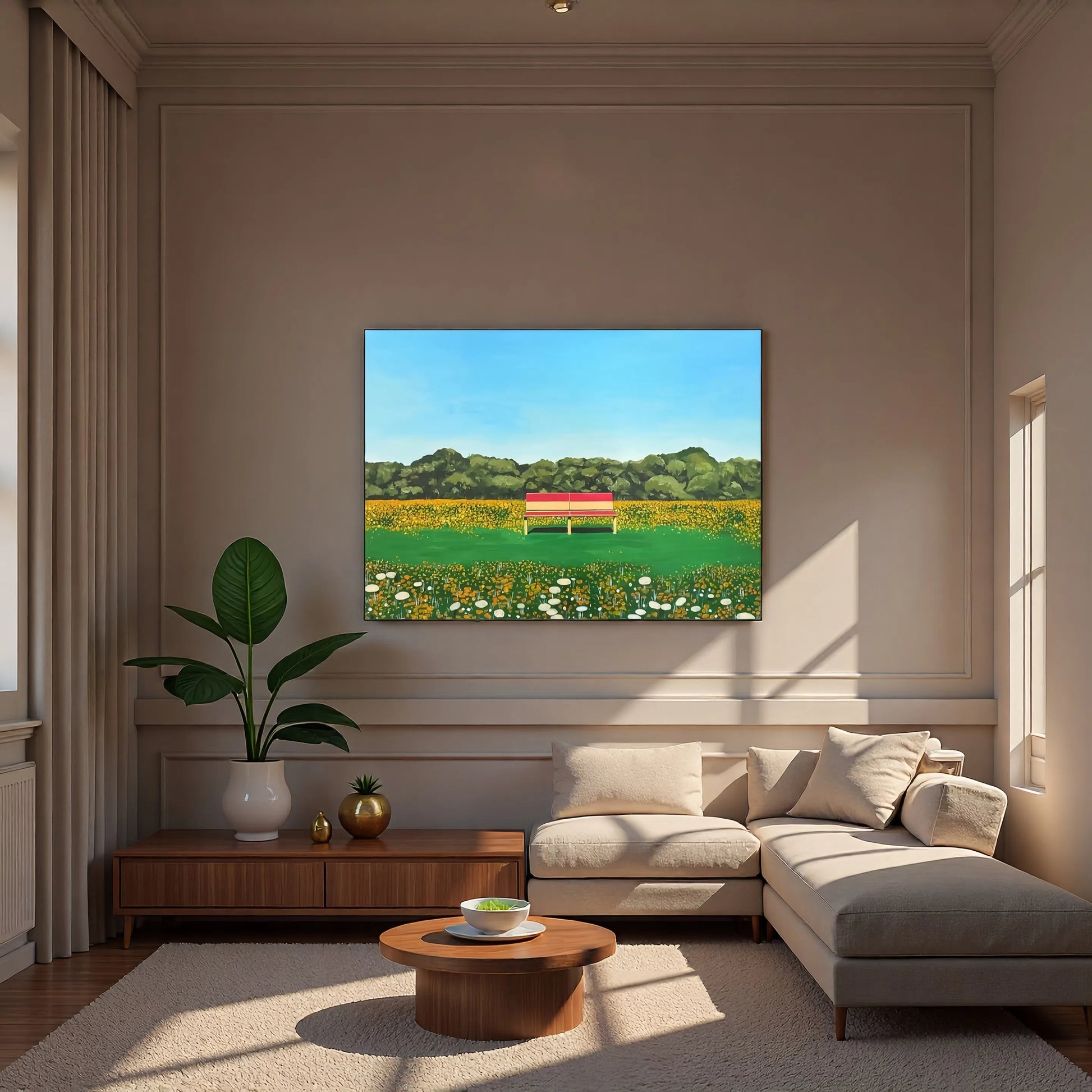 With delicate brushwork and balanced tones, the artist blends tranquility with passion. The empty bench becomes an open invitation for viewers to step into the artwork, adding their own stories of memory and love.