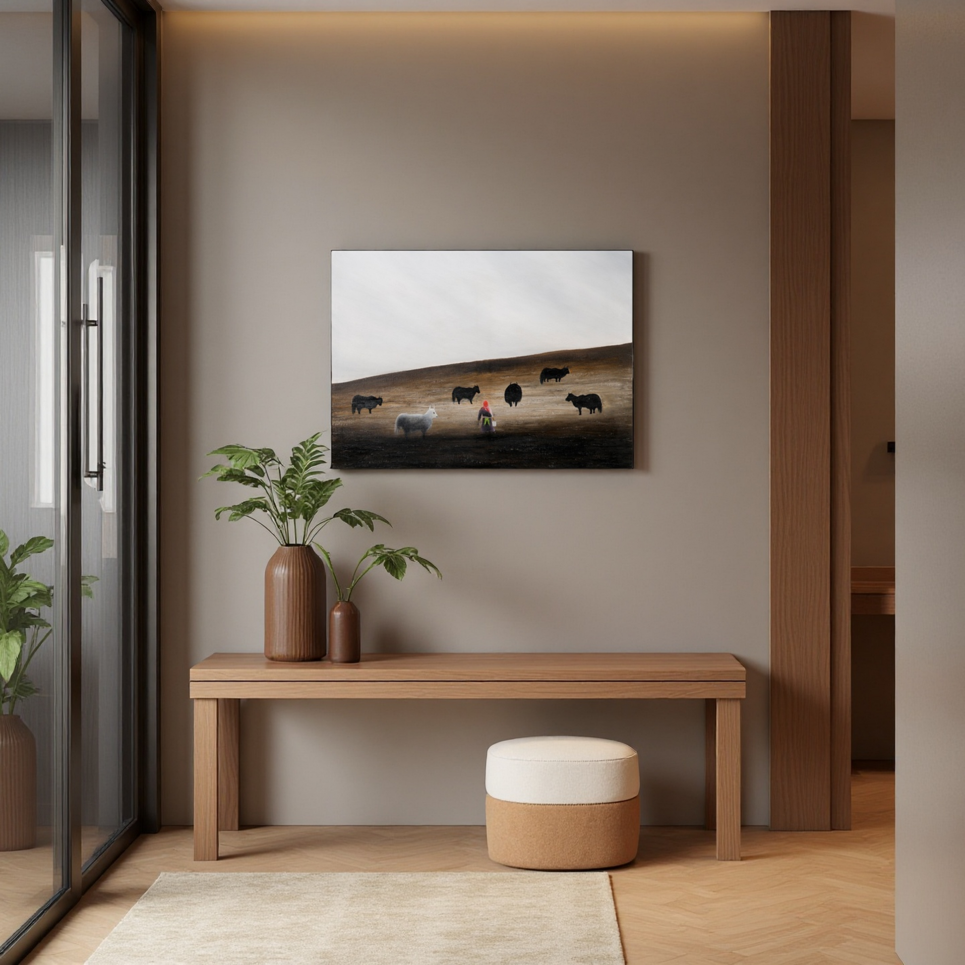 The distribution of black yaks and a lone white sheep across the sloping terrain creates a sense of rhythm and space.
