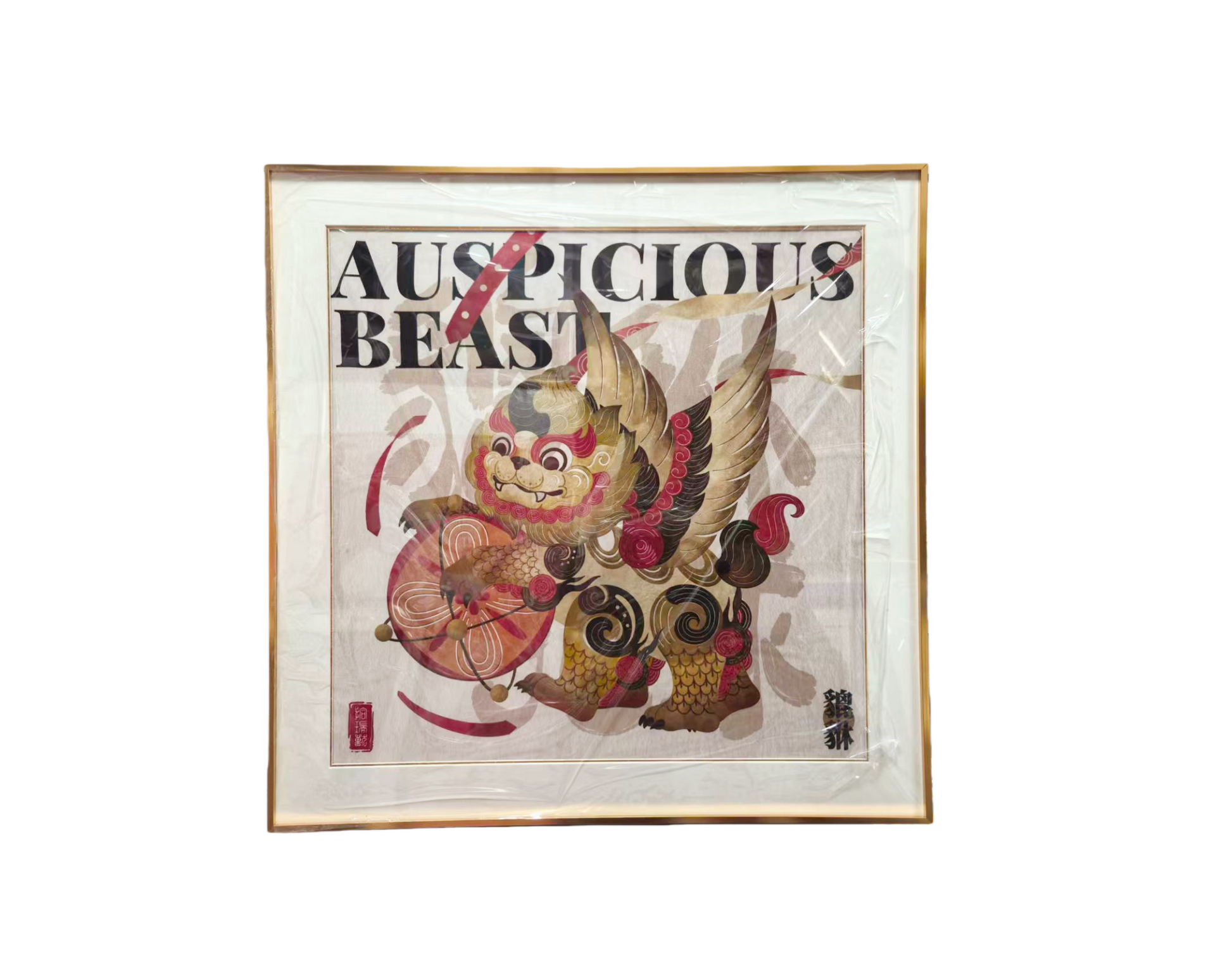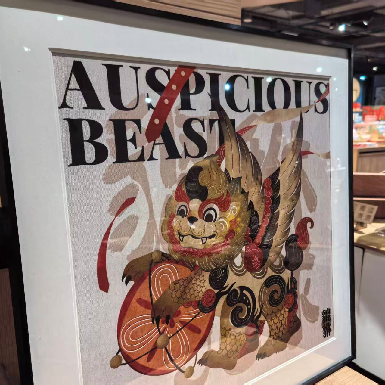 Top text: “AUSPICIOUS BEAST” — an international expression of mythical blessing.