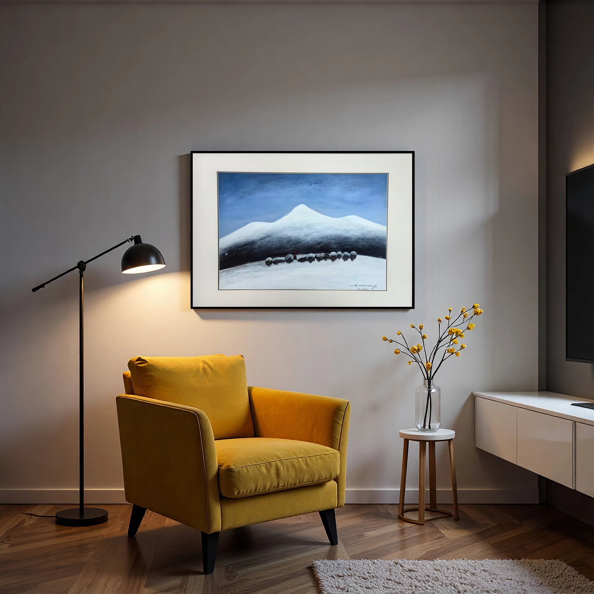 The soul of the painting is the solitary herder. His small figure contrasts sharply with the vast, harsh natural backdrop, highlighting his unyielding spirit to uphold his duty despite the overwhelming odds. The piece transforms the daily act of herding into a poetic ode to resilience and vocational commitment.